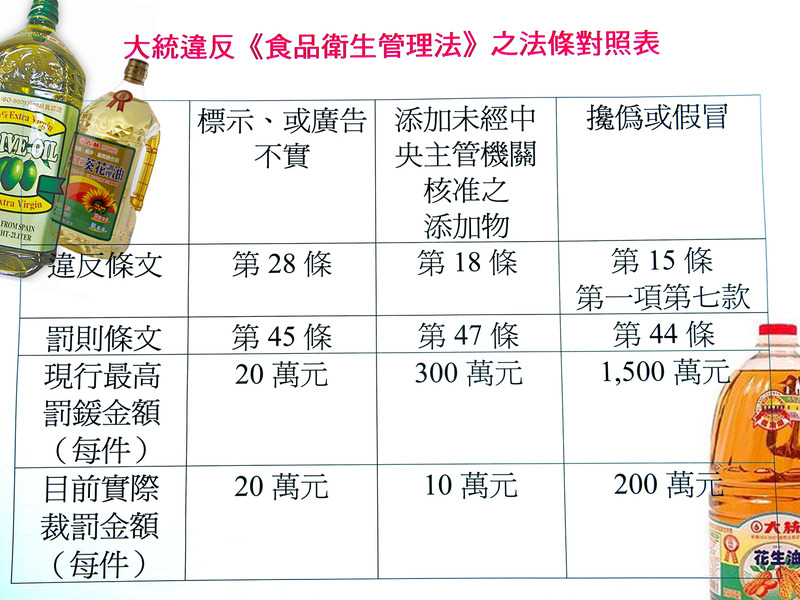 事實上,《食品衛生管理法》歷經塑化劑、毒澱粉事件,在民間團體不斷鼓吹「亂世重典」之下,也確實促成立院修法提高裁罰金額,但以大統為例,目前確定開罰2460萬元,若採最高罰則將達到2.1億元;「罰款一部分的概念是為追討不法所得。」消基會秘書長雷立芬說,「罰款金額太低,根本無損黑心業者所獲暴利。」