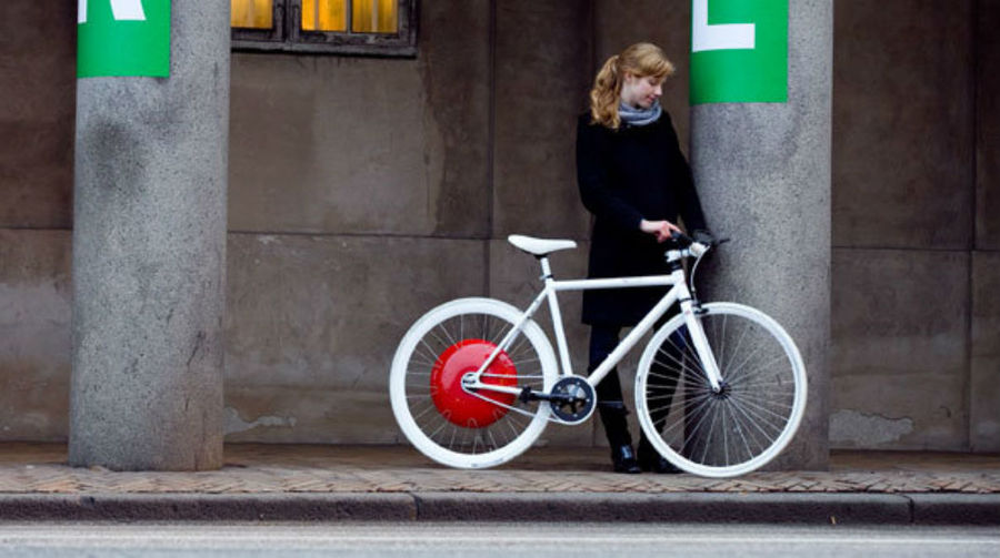 由麻省理工學院設計的「哥本哈根車輪」(the Copenhagen Wheel),軸心有一個紅色圓形箱子,內置電池供電的輪鼓馬達和傳感器,單車後輪裝上哥本哈根輪胎,