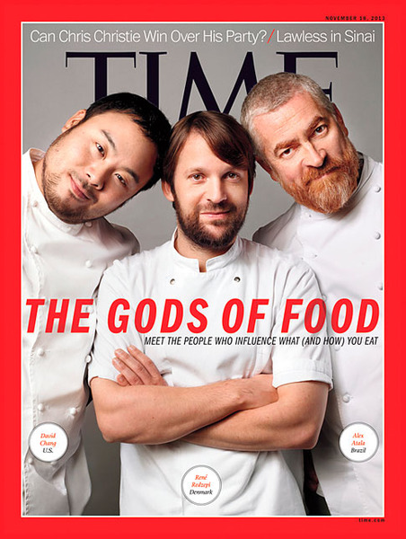 本期《時代雜誌》專題報導六組影響餐飲趨勢的當代餐飲要人:Wan Long之於豬肉、Sun Myung Moon之於壽司、Dan Barber之於新品種蔬菜食材、Yotam Ottolenghi和Sami Tamimi之於以色列特色料理、Aida Batlle之於咖啡,以及聖保羅的Alex Atala、哥本哈根的René Redzepi、紐約的 David三人之於一場新興的年度國際料理研討會──MAD。