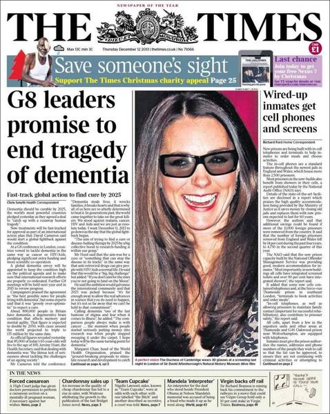 在英國倫敦舉行的G8高峰會剛落幕,會議上各國領袖決議,將把失智症(demantia)視為如癌症、愛滋病同等嚴重的疾病,並要求各國立即著手處理。預計將在2025年以前研發新藥品與治療方法來防治老年癡呆症。