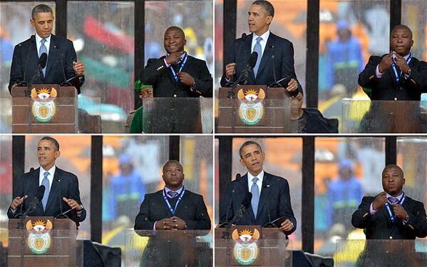 【台灣醒報記者邱慕天綜合報導】全球矚目的曼德拉追思會受到媒體緊盯,後續風波不斷。不僅美國總統歐巴馬與丹麥女總理舒密特調情自拍的畫面在網路瘋傳,大批現場民眾不耐久坐提前退席的騷亂也出了國際洋相,現在更傳出在台上與歐巴馬貼身的南非手語傳譯員也是個冒牌貨,並自稱有「幻覺」和「精神分裂」。此事不僅讓國際維安捏了一把冷汗,更讓南非國際形象重創。