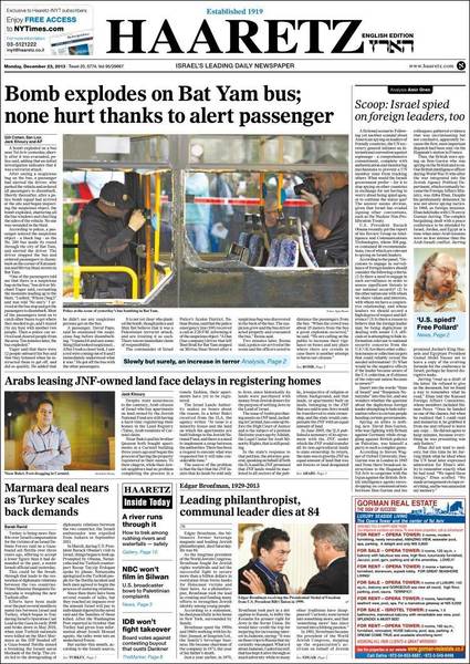 以色列中部特拉維夫附近一輛巴士遭到炸彈攻擊,當時車上載有12名乘客,途中一名乘客發現座位上的書包藏有炸彈,趕緊通報司機。當下司機察覺不對勁,立即停車疏散乘客並報警,10分鐘後炸彈就將公車尾部炸出一個大洞,玻璃碎片飛濺,場面驚險。
