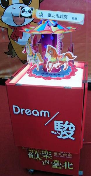 「這五匹馬分別有不同的意義,由『白、棕、黑、紅、紫』等不同色系的馬組成,象徵馬年之際,民眾追求夢想的同時,能以堅持不放棄的精神,並以紅色赤兔馬的形象,展現氣勢,拔得好運。」北市府民政局長黃呂錦茹說,2014年台北燈節主題燈籠,名為「Dream-駿」,以中文「駿」字為諧音,希望木馬轉動時,充滿歡樂與夢想的概念,不僅能祝福民眾,也帶出馬年奮發的意涵。