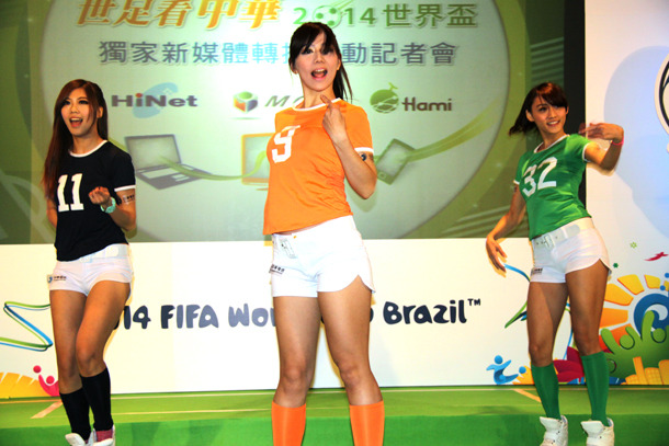 中華電信於21日舉行記者會,公布取得新媒體轉播權,還找來辣妹熱舞和花式足球員展現球技。中華電信總經理石木標和愛爾達執行長陳怡君特地穿著紅藍白三色球衣蹦跳進場,還興奮擊掌道賀。
