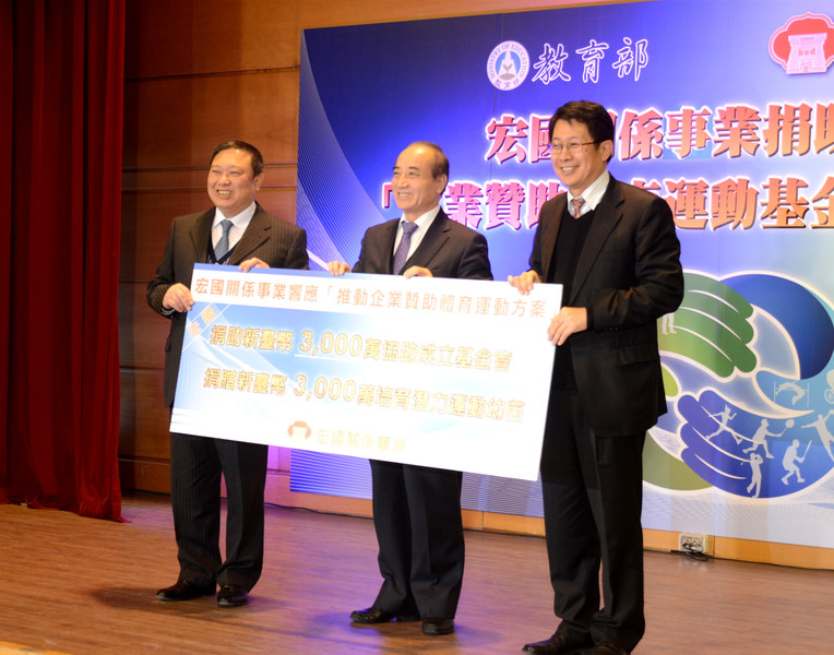 【台灣醒報記者彭書穎綜合報導】企業助體育動起來!教育部體育署為了讓國內運動員有更好的生涯發展,從去年開始提出企業贊助方案,22日宏國關係事業捐助3千萬台幣作為成立「企業贊助體育運動基金會」的母基金,並再加碼3千萬作培訓年輕運動員的相關經費。宏國副董事長林鴻道表示,希望這些經費能讓國內體育重新充滿活力。教育部長蔣偉寧更發下豪語在今年要募集10億經費。