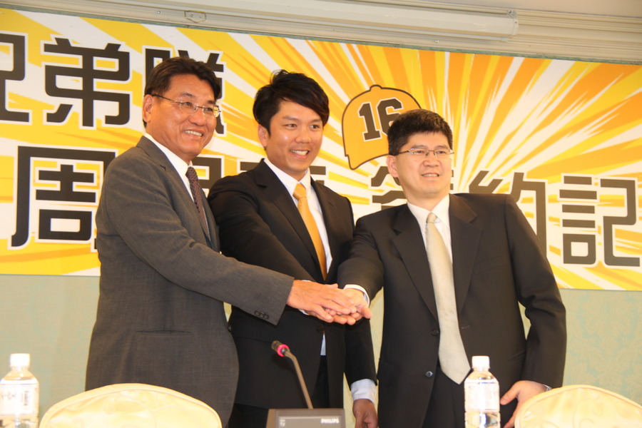 中信兄弟隊28日為周思齊簽約舉行記者會,除陳正宏外,「草總」總教練謝長亨與中信金總經理辦公室副總孫紀蘭也一併出席。
