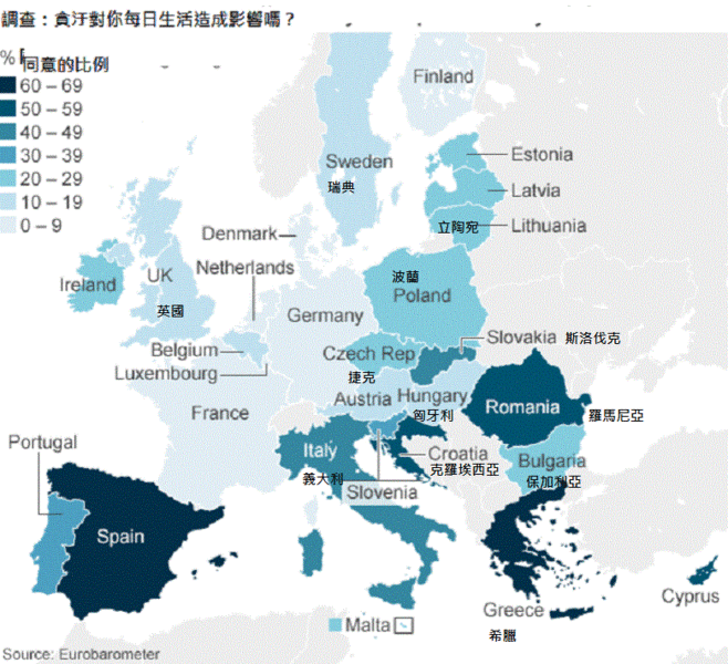 這是歐盟首度對28個會員國進行貪汙調查,結果顯示,76%的歐洲人認為,貪腐現象已十分普遍,超過一半(56%)的民眾表示,過去3年以來,他們國家的貪腐程度正在加劇。
