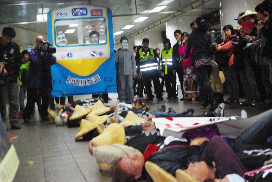 【台灣醒報記者陳正健台北報導】工人團體以行動劇重演「臥軌」,爭取資遣費與勞工權益。去年2月5日,全國關廠工人連線跳下台北車站月台,以臥軌方式進行抗議,事隔一年他們再度北上,在苗栗竹南、桃園、板橋和台北火車站抗爭,要求勞委會立刻認定所有關廠工人的案件為「公法事件」,修改勞基法第28條,將資遣費、退休金納入墊償基金的支付。