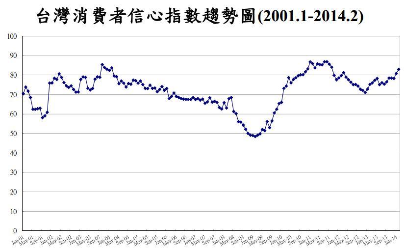 中央大學台灣經濟發展研究中心27日公布103年2月分消費者信心指數調查報告。經研中心主任吳大任表示,總指數82.93點已接近2011年的歷史高峰86.89點,連續兩個月顯著上升。