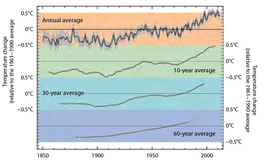 報告指出,地表氣溫自19世紀以來已上升攝氏0.8度,高峰期始自1970年中期,根據地表及海洋無數觀測站的數據顯示,1983年至2012年是過去8百年間,氣溫最高的30年。暖化反映在多重結果上,包含低層大氣與淺海溫度都升高,北半球雪量及冰帽縮減、格陵蘭冰原倒退以及海平面上升等。