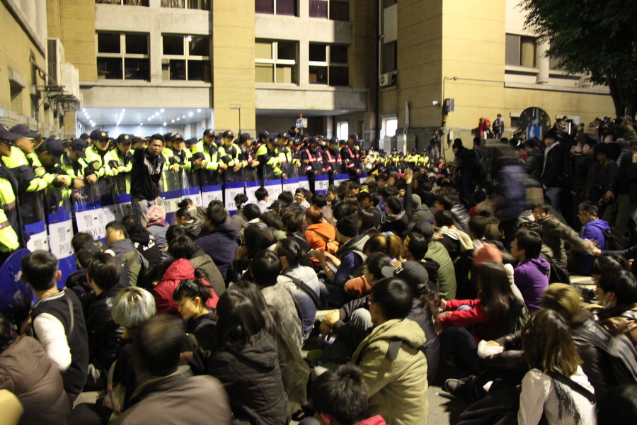 【台灣醒報記者賴義中台北報導】繼立法院後,行政院也遭占領!約千名反服貿學生與民眾於23日晚間8時左右強攻行政院,由於現場警力不足,民眾迅速拿下政院兩個前門,隨後宣布占領行政院;至晚間11時左右,大量警備車、鎮暴警察已於政院外部蓄勢待發。總統、江揆已於同一時間下令警方驅離,現場民眾無不保持警戒,至12時左右,政院內外已擠入近萬名民眾,並持續有人潮湧入。