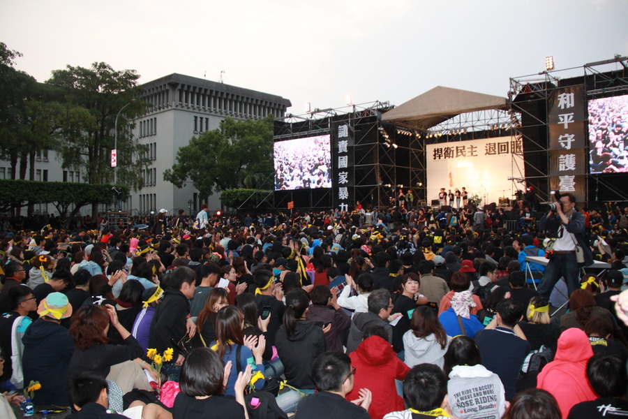 晚間7時左右,凱道現場合唱起學運主題曲〈島嶼天光〉,現場民眾揮舞手機,將LED燈光當作燭光,隨樂聲起舞。工商服務、農村武裝陣線等獨立樂團,也上台獻唱。