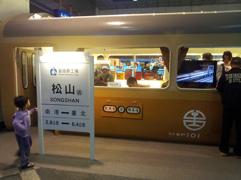 有別於夢工場台北旗艦店與高雄店,台鐵松山文創商店不僅外觀採第一代自強號電聯車的擬真設計,連店內都有從原車拆卸下來的雙人座椅、單人商務艙座椅、茶杯架、行李架、衣帽掛勾、座號牌、服務鈴等,設計非常細膩,就連商店外牆上的車燈都是原封不動從EMU100上移過來,造景精細,令人目不暇給。