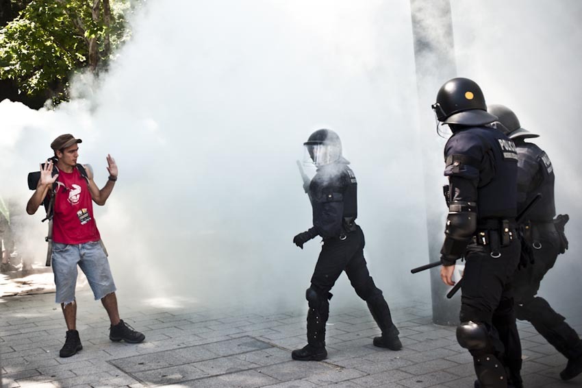 根據馬德里當局的統計數字,和平抗爭轉變成暴力衝突的機率不到1%;但國際特赦組織報告表示,即使群眾遊行抗疫過程和平,警察仍時常毆打、逮捕、起訴或開罰單給抗議民眾,甚至祭出警棍、橡膠彈等武器。在2012年一場巴塞隆納抗議中,秦塔娜遭警方橡膠彈擊中左臉,導致顴骨破損、左眼失明,有許多影片和證人也證明,警察確實使用橡膠彈對付手無寸鐵的民眾。