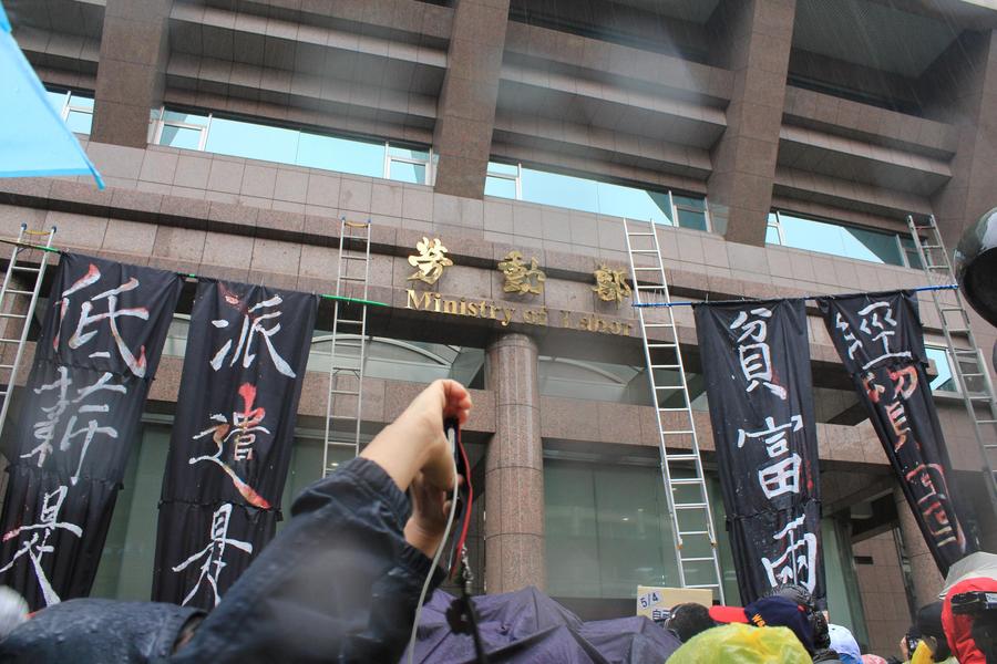 【台灣醒報記者邱惠恩台北報導】「低薪是國恥,派遣是元兇,貧富兩極化,經貿圖利誰。」五一勞動節當天2萬人從凱道出發遊行至勞動部,在大雨中怒吼「反低薪、禁派遣」,且為了在勞動部三個大字旁邊高舉黑布條,一度與警方發生推擠衝突。勞動部近四點時拉下鐵門,除了維持秩序的警察外,沒有任何人出面回應訴求。