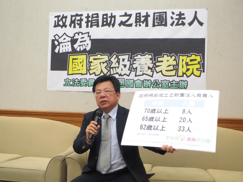【台灣醒報記者方家敏台北報導】財團法人淪為政府養老院?立法委員李俊俋28日召開記者會指出,公布政府所捐助59個財團法人之負責人年齡,其中最高齡為78歲,70歲以上有8人,65歲以上有20人,已違反立法院今年初審查預算時所作之65歲上限決議。李俊俋批評,政府所捐助的財團法人,不應是退休高官的養老院,要求行政院必須遵照立法院所作決議辦理。