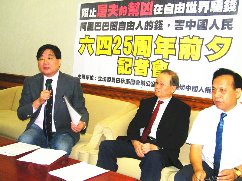 【台灣醒報記者陳正健台北報導】因發表認同六四鎮壓言論的阿里巴巴負責人馬雲,近日遭旅美民運人士的強力杯葛,在六四屆滿25年之際,台灣的反共人士也出面抵制。台灣關懷中國人權聯盟理事長楊憲宏等人28日召開記會表示,據說馬雲有來台計畫,而台灣一些銀財專員可能仲介投資人阿里巴巴的上市股票,希望台灣人民不要成為「屠夫幫凶」。