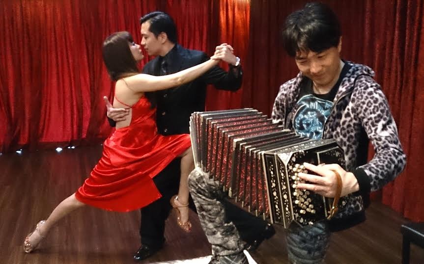 日本手風琴大師小松亮太,拿著阿根廷班多鈕手風琴與台灣探戈舞者共舞。(photo by 杜胤廣/台灣醒報)