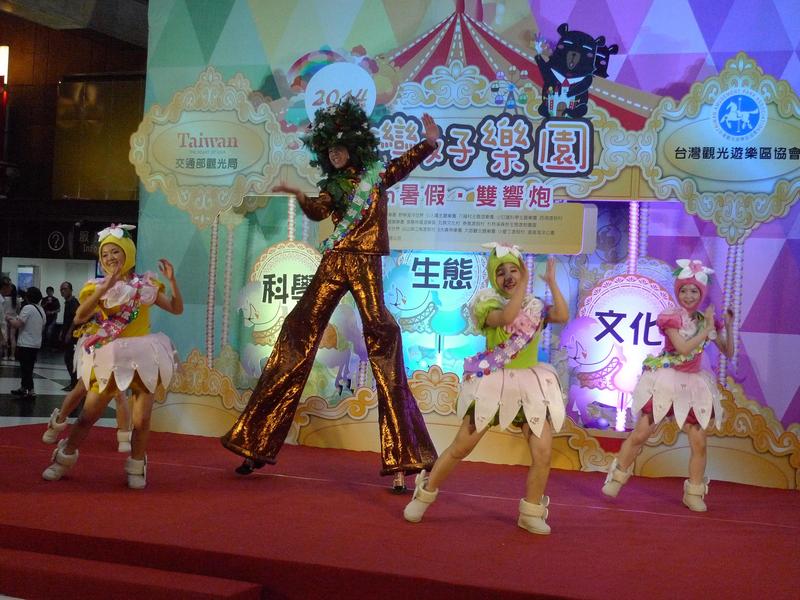 23日下午,各遊樂園的吉祥物塞滿台北車站大廳,在音樂聲中手舞足蹈、花招百出,劍湖山世界主打「飛盜劍湖山」,找來北海小英雄作為吉祥物,現場勁歌熱舞,吸引民眾駐足。西湖度假村的四位花仙子模樣可愛,和踩著高蹺、高人一等的樹精靈共舞,十分吸睛,也是會場內攝影機捕捉的對象。