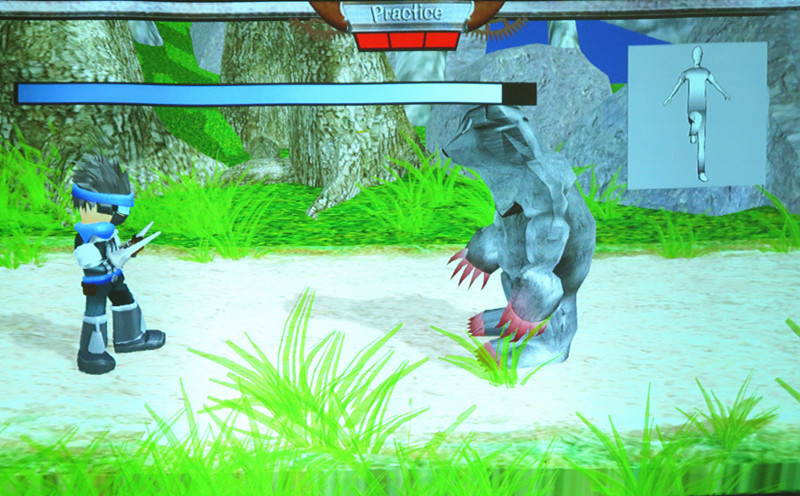 嚴格講,他們這個遊戲有點像跳舞機,就是玩家要跟著畫面上的人做出抬腿、橫移、金雞獨立等動作,只是帶動作的人形是在遊戲畫面右上方的角落,而遊戲主畫面角色的「武打招式」,則是靠玩家的復健動作來「啟動」,所以當大家一直問示範的學生,「你們做的動作,明明就跟主角不一樣」時,學生就出現了有點「囧」的臉孔,又解釋得有點詞不達意,看起來蠻累的。