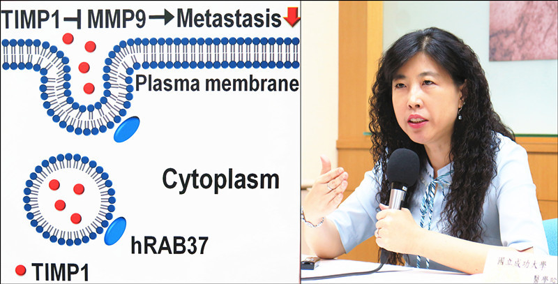 王憶卿指出,Rab37的「乘客」之一,是「金屬蛋白酶組織抑制劑(TIMP1)」,TIMP1負責抑制另一種酵素「基質金屬蛋白酶(MMP9)」在細胞外作用;MMP9會把細胞間隙「弄鬆」,造成癌細胞穿過細胞間隙而轉移至淋巴、血管或身體其他部位。
