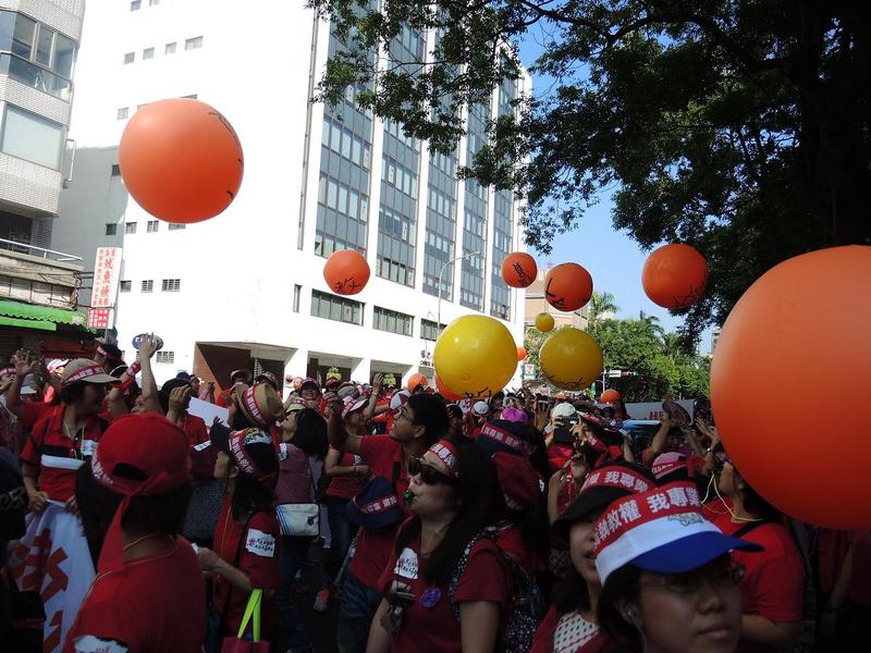 教保員在抗議現場還準備了象徵「教保人球」的巨大氣球,在人海之間不斷被拋傳,控訴從內政部被整合至教育部後,教保員卻好像「灰姑娘」一樣惹人嫌,權益不斷被踢來踢去。