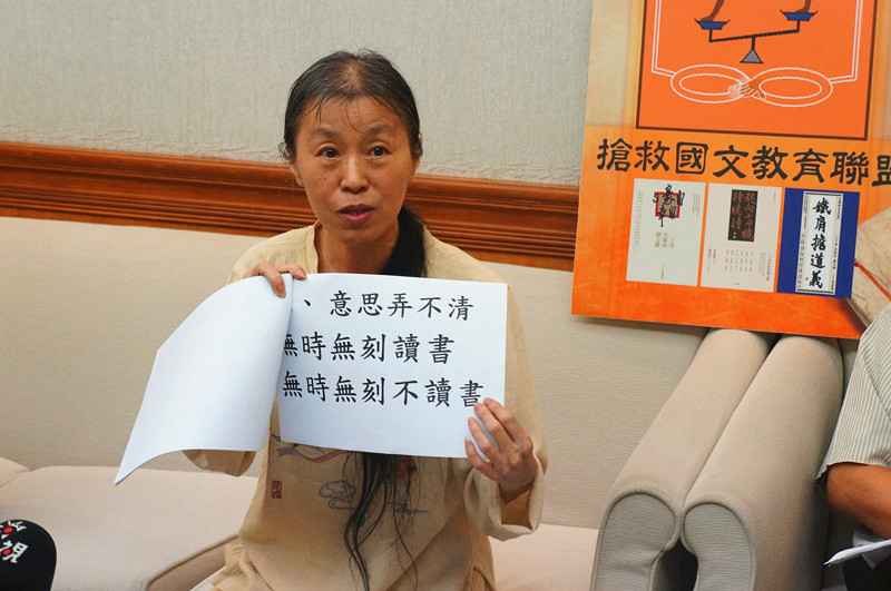 搶救國文教育聯盟執行秘書李素貞,手拿一疊錯別字的範例。她說,現在的學生連基本用字都會犯錯,例如「煩惱」寫成「煩腦」。隨著國文時數的變少,學生的語言基本功每下愈況。