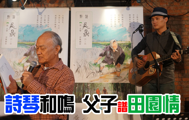 吳晟和吳志寧父子2人一人手捧詩集朗誦,另一人手持吉他彈奏,道出回歸自然土地的美好嚮往。(photo by 陳昱穎/台灣醒報)