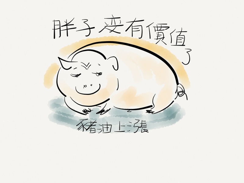 牠先是跟我道歉,說剛剛在櫃台邊不是有意撞到我的──雖然我對此毫無印象。然後牠點了一杯酒請我喝,並且開始介紹牠們公司自己出產的豬油。牠用豬蹄點出iPad 上的一連串圖片,從最近的豬油、牛油風暴中噁心煉製過程的圖片,再到他們的自營農場幾年來慘澹經營的實況,到此次終於獲得機會、鹹魚翻身等等。牠口若懸河的程度讓我想到《動物農莊》裡那幾隻發跡的豬領導人。