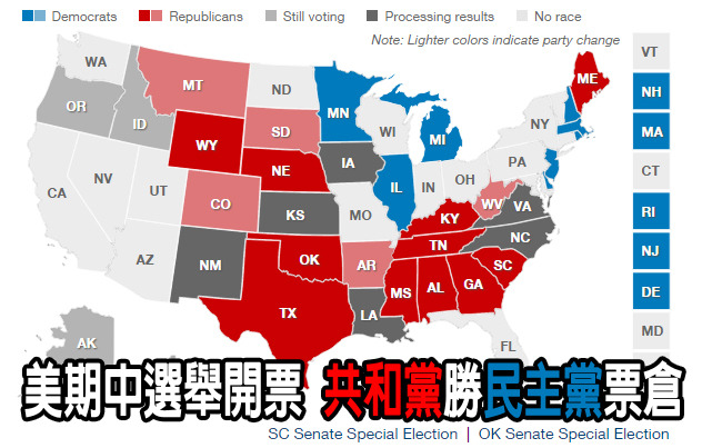 截至上午12點為止,共和黨已拿下參議院中的48席,只差2席就可過半數;而科羅拉多州、堪薩斯州、喬治亞州、路易斯安那州、北卡羅來納州等地區,都可見共和黨候選人的得票數勝過民主黨對手,參議院要由藍(民主黨代表色)轉紅(共和黨代表色)是遲早的事。