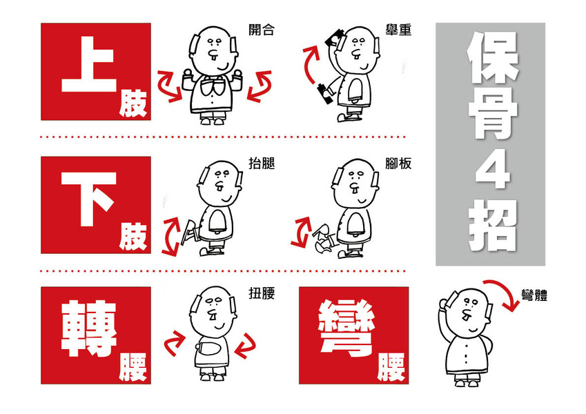 「每天做『上、下、轉、彎』等4組簡單動作,就可預防『肌少、骨鬆、骨折』發生。」楊俊毓解釋,上肢訓練動作類似單、雙手舉啞鈴及上臂開合,只要利用簡單的礦泉水瓶,就能加強肩、肘關節及手、胸部肌肉。下肢訓練包括坐姿抬腿及類似「金雞獨立」的站立抬腳、伸展腳背,可加強柔軟度與平衡感。轉體類似上半身向後轉、彎體類似側面肢體伸展,有助強化手臂、肩膀、腰部與背部肌肉。