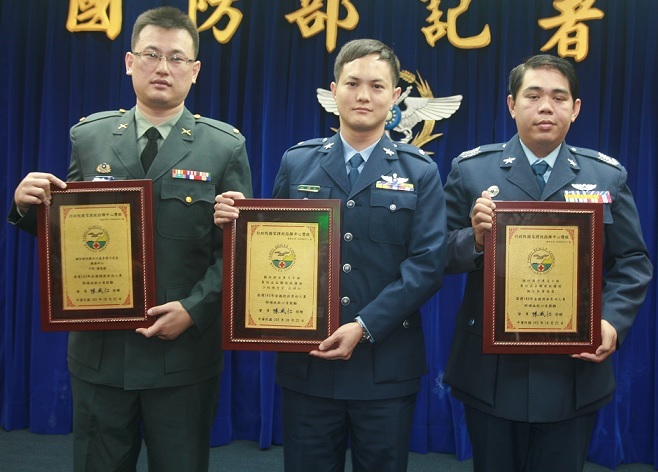 國防部發言人羅紹和12日在例行記者會中,邀請獲行政院103年度搜救有功人員,空軍455聯隊少校孔祥仁、士官長曾德昌,及前國防部戰情中心少校協調官唐先捷等3人,分享獲獎心得以及記憶中最深刻的救災經驗。