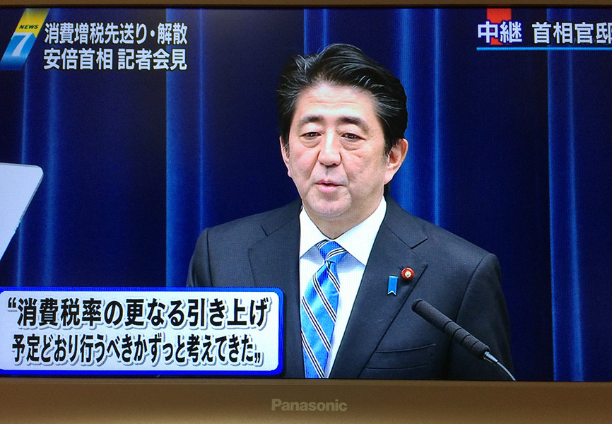 日本內閣府2014年11月17日公布第3季經濟情勢速報, GDP成長率連續兩季大幅度下跌,顯示日本經濟的衰退,震撼日股大跌511點,也成為歐美社會普遍關注的頭條大新聞;翌日,安倍晉三宣布,原定2015年10月消費稅再調高兩個百分點至10%的行動,將延後一年半實施,同時確定11月21日解散眾議院,於下個月14日投票組成新眾院。安倍的明快決策,事實上也不啻宣告「安倍經濟學」的正式失靈與失敗。