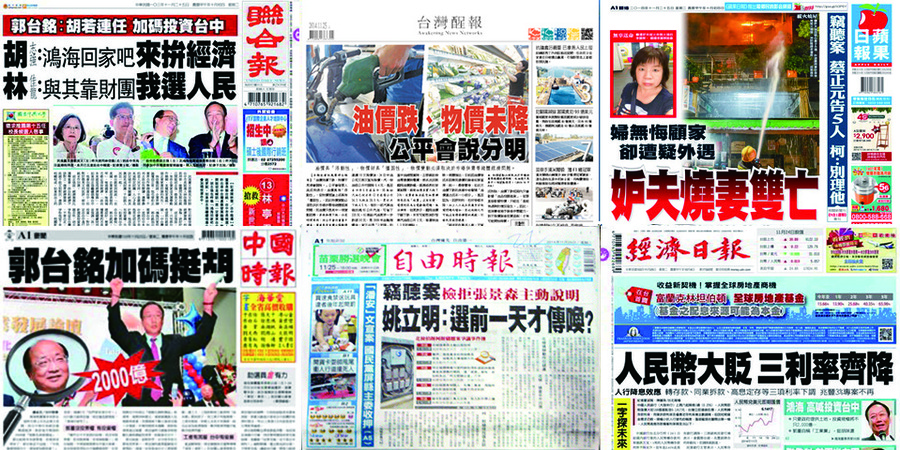《聯合報》針對郭台銘承諾加碼投資台中一事,並呈藍綠雙方的說法與態度,胡志強表示,經濟比選舉重要,認為不應因政治而傷害國家經濟的發展;林佳龍則表示,選舉是人民的支持,而並非是特定的派系或財團。《中國時報》頭條則分析並陳述郭台銘的投資計畫,認為台中有很多的「世界第一」競爭優勢,具備產業未來發展。