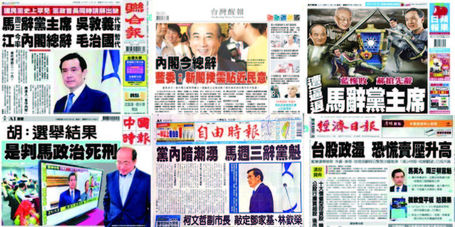 《蘋果日報》頭條形容馬英九辭黨主席,是受到內外逼宮的壓力所致,認為馬主動辭職是為了化解選後的黨內鬥爭和逼宮聲浪。頭條也分析後續接任人選,提及吳敦義、朱立倫、王金平等人接任的可能和阻礙。