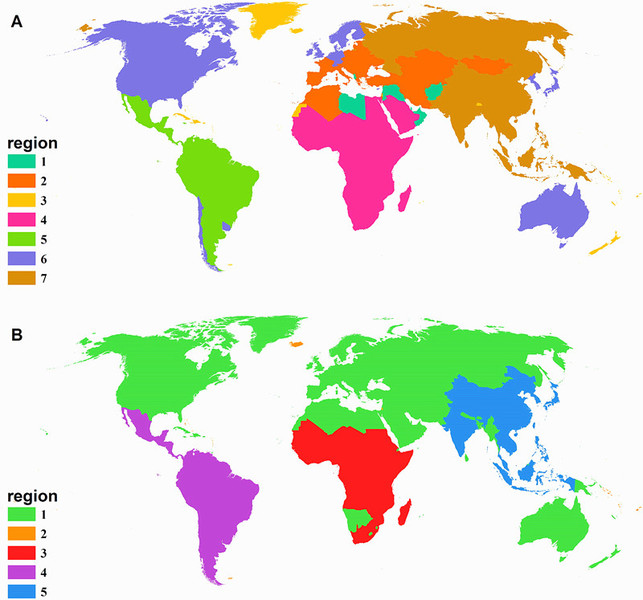 研究人員分析全球229國中,93種「病媒性」疾病及208種「非病媒性」疾病的分布情形,將全球劃分為7個病媒性疾病區及5個非病媒性疾病區。賈斯特解釋,病媒性疾病需仰賴昆蟲等媒介散播,例如由蚊子散播的瘧疾,而霍亂弧菌造成的霍亂則屬非病媒性疾病;這2類疾病的分布並不相同,因此拆成2份地圖呈現。而病媒性疾病因受到昆蟲、家禽、家畜及野生動物的活動區域影響,較非病媒性疾病多出2區。