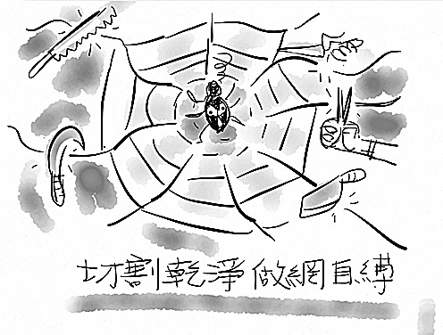 我用眼神和揮舞的八肢示意他們別再咬斷了,即使我知道換做是我,也不會照辦。他們還是張口了,我的蜘網一點點傾斜,最後是我鄰居兼童年玩伴的那隻蜘蛛咬斷最後一根維持我平衡的線,腳下的蛛網崩解,同時我感到自己開始墜落。