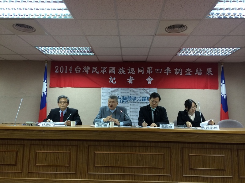 台灣競爭力論壇16日發佈2014年第4季台灣民眾國族認同調查的結果,負責調查的艾普羅民調公司協理游彩玲報告指出,台灣民眾對於中華民族的認同,經過今年的太陽花學運及9合1選舉,並未呈現下滑的趨勢,仍有85%的民眾認為自己是中華民族的一份子,只比去年減少2.3%。