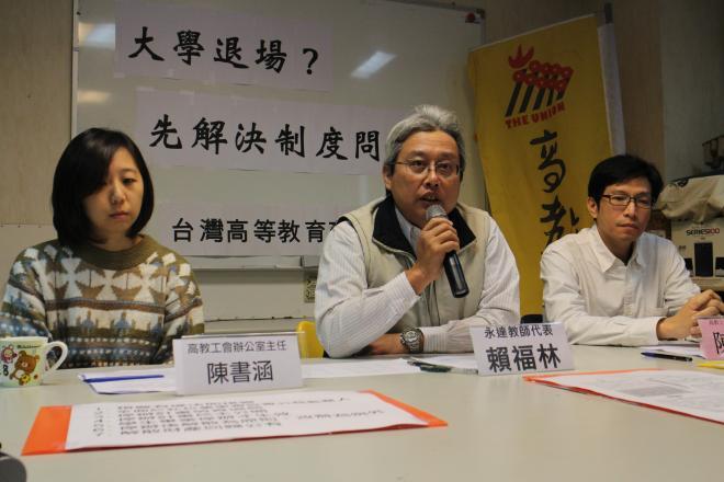 「少子化、大學退場不是永達師生的錯,他們卻成了代罪羔羊。」高教工會22日舉辦「大學退場?先解決制度問題」記者會。在永達技術學院停辦核准後,原教師賴福林指出,因為停辦計畫過於倉促,產生許多安置的後遺症。