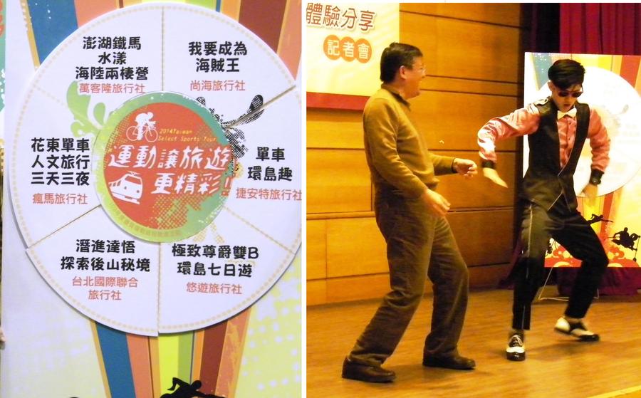 【台灣醒報記者陳彥驊台北報導】體育署主任秘書與舞者齊跳「騎馬舞」,將現場氣氛炒得火熱,眾人也看得津津有味。行政院體育署為推展運動與觀光產業異業結盟,22日舉辦「優質運動遊程徵選活動」記者會。現場也頒發「我是運動玩家」徵選活動獎項,由橫越美國的自行車愛好者奪得首獎。