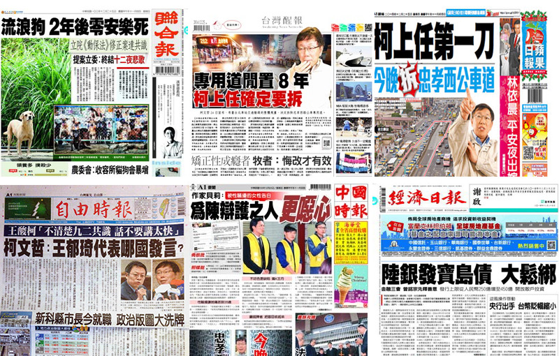 《聯合報》頭條關注立院《動物保護法》修正草案已達共識,廢除流浪動物送收容所12天後需安樂死的規定,並速上本會期三讀,以推台灣成為收所零安樂死的國家。《自由時報》頭條則聚焦在柯文哲和王郁琦針對「九二共識」的隔空辯論,柯提出「一五共識」,王則批柯應先多了解九二共識,再來評論。