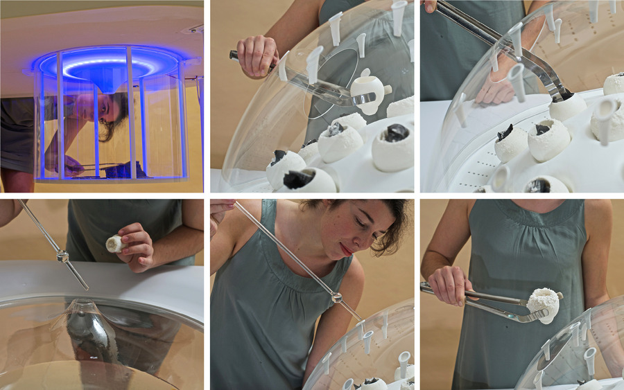 但菌類在分解塑膠之前,必須先將塑膠放進催化室照射紫外線光殺菌,再把塑膠放在一個用海藻製成的半圓蛋狀物體中間。該物體呈半透明,類似石花凍,只要加入糖和澱粉,就可做為菌類的培養基。最後將菌絲放在一顆顆的蛋狀物上,並連同塑膠放進液態氮,使其作用、分解。