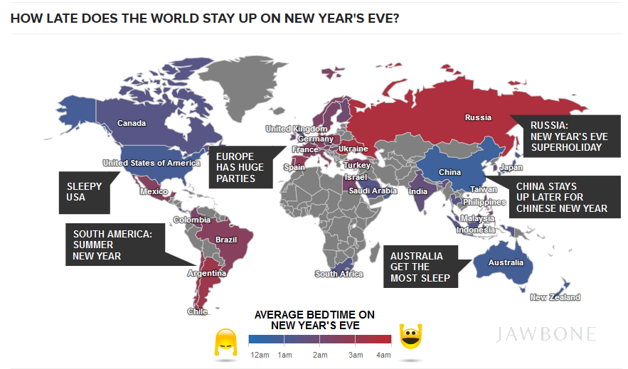 販賣健康智慧器材的Jawbone美國公司,蒐集了上萬筆客戶的睡眠時間紀錄,歸納出一份趣味性十足的「2014年跨年熬夜地圖」。