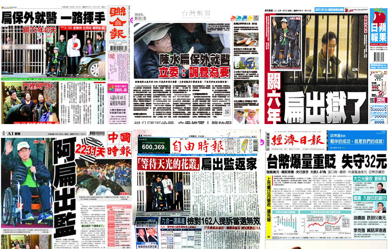 《聯合報》頭條報導,從台灣監獄接到公文至辦妥具保,時間花不到3小時,另指出扁刑期20年,目前僅服刑約3分之1。《中國時報》頭條則描寫及引述支持者的興奮之情,並訪問前副總統呂秀蓮指出,扁獲釋象徵著藍綠的和解。