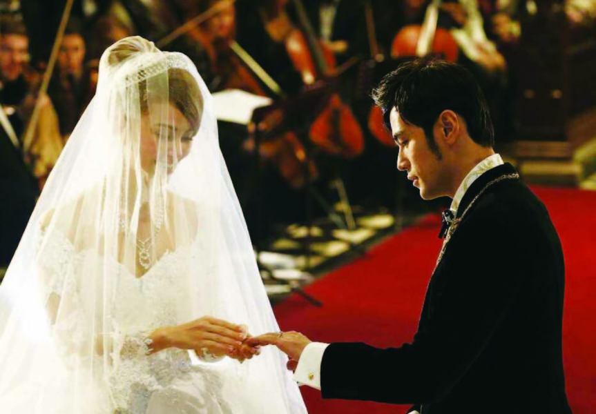 台北時間今清晨的婚禮儀式,周董譜寫結婚進行曲,搭配當地20人的管絃樂伴奏,原訂昨晚9點半開始的儀式,因反覆跟著進行曲走位彩排Delay,延至11點半開始。2人交換戒指後親吻。周董不接受贊助,不過新娘昆凌另依經紀公司安排,戴上「CHAUMET」鑽石鑲鉑金皇冠與項鍊,總價值6千萬台幣。