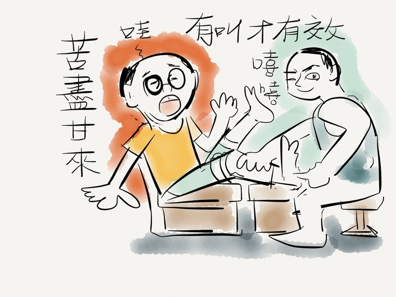 老雷沉住氣後再次緩緩摸索小李腿上的穴道,足有幾分鐘之久,眾人感覺好似兩人已僵持幾個鐘頭。終於他摸到小李腿骨上多年前穿出性骨折的舊傷,小李眉頭吃驚地一揚,老雷知道命中,雙手發力一壓。周遭人都清楚聽見骨頭「啪嘎」的錯位聲,小李腿筋抽動,全身都顫跳起來,臉孔扭曲了一下,額頭冒汗──但終究抿住嘴唇,沒有出聲。