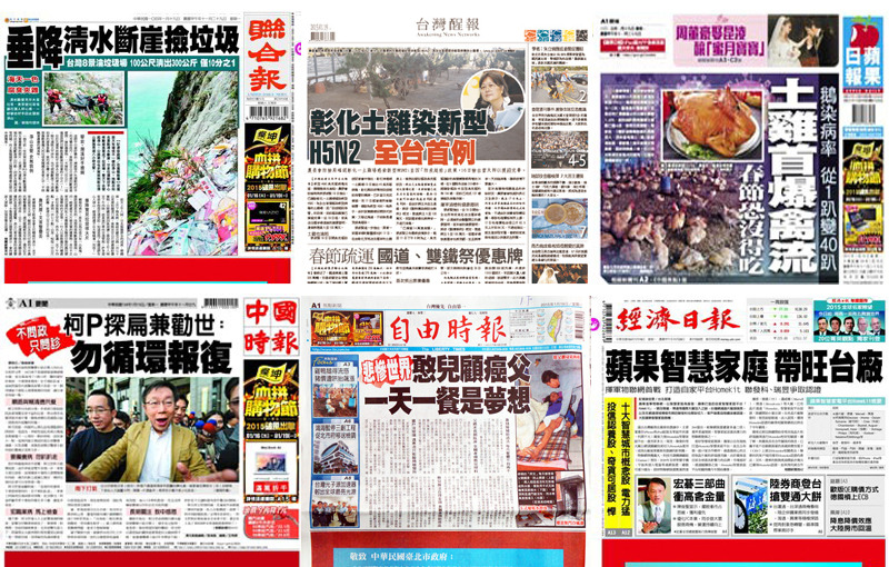 《蘋果》頭條指出,目前疫情家禽類屬鵝最嚴重,異常已達全台鵝場的4成,今再爆彰化土雞場感染新型H5N2,春節恐將無土雞可買。《醒報》則強調,土雞場受感染雞隻已全數撲殺,另為確保疫情不致擴散,自18日起全台家禽在送往屠宰場時,須檢附由獸醫開立的健康證明,違者將處5至100萬元不等。