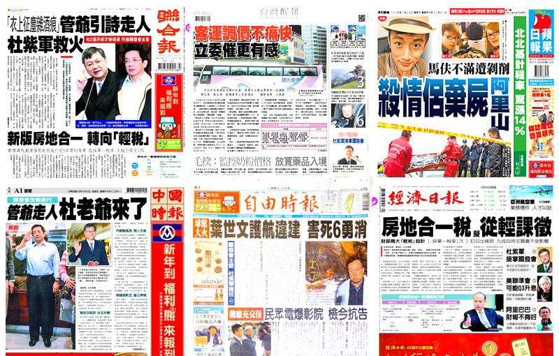《自由時報》的頭條焦點則是關注桃園新屋大火,報導將問題指向前副市長葉世文包庇違建所致。《蘋果日報》的頭條則是馬伕怒殺老闆的社會新聞。
