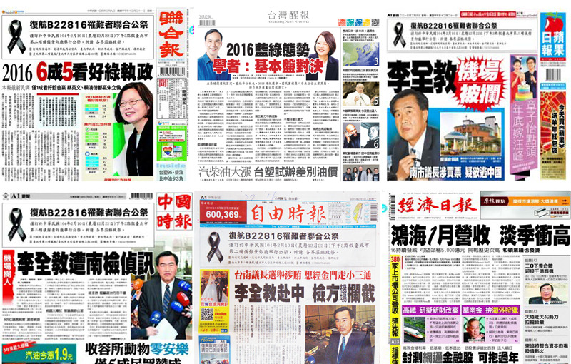 【台灣醒報記者王奕超報導】因身陷台南市議長賄選案,而企圖逃赴中國的台南市議長李全教昨天下午遭台南地檢署攔截,成為9日《中國時報》、《自由時報》、《蘋果日報》的頭版頭條。2016年的總統大選對決情勢,則成為《聯合報》、《台灣醒報》的頭條焦點。