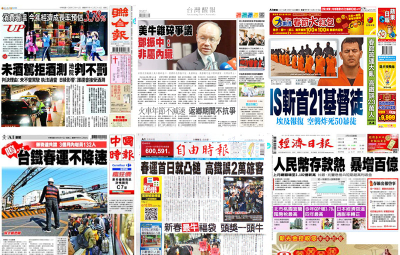 至於其他各報17日的頭條,《聯合報》報導一則判例,指出警方在無合理懷疑的情況下,強迫駕駛人接受酒測,將違反警察職權行使法;《自由時報》則報導春節輸運首日,高鐵接連出包,上午先車門訊號異常,傍晚又發生道岔訊號異常,報導引用了民眾的批評,稱高鐵應變能力不足;《蘋果日報》的頭條則報導了IS於埃及斬首21名基督徒的消息。